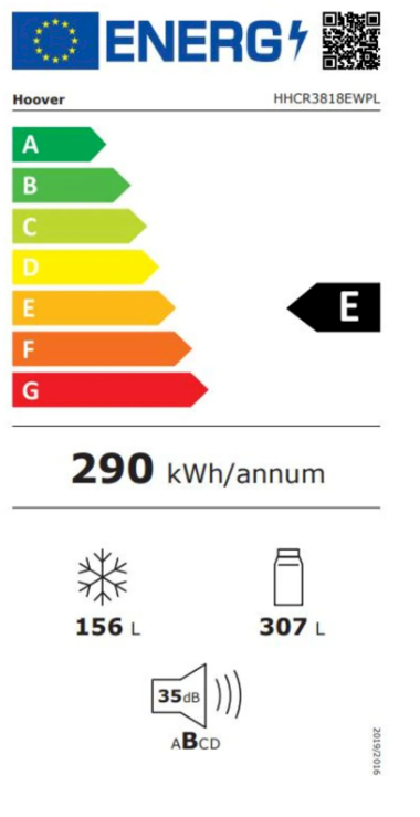 Hoover HHCR3818EWPL je prostostoječi ameriški hladilnik s štirimi vrati in skupno prostornino 463 litrov, kar vključuje 307 litrov za hlajenje in 156 litrov za zamrzovanje. Opremljen je s tehnologijo Total No Frost, ki preprečuje nabiranje ledu, ter z večtočkovnim kroženjem zraka za enakomerno hlajenje. Invertorski kompresor zagotavlja tiho delovanje in energetsko učinkovitost, kar potrjuje energijski razred E. Na vratih se nahaja priročen dozirnik vode, ter elektronski zaslon za enostavno upravljanje funkcij, kot sta hitro hlajenje in zamrzovanje. Notranjost je osvetljena z LED lučmi in vsebuje steklene police s srebrnim okvirjem ter integrirane ročaje za eleganten videz. Zaradi svoje širine 833 mm, višine 1815 mm in globine 650 mm se odlično prilega večini kuhinjskih prostorov.